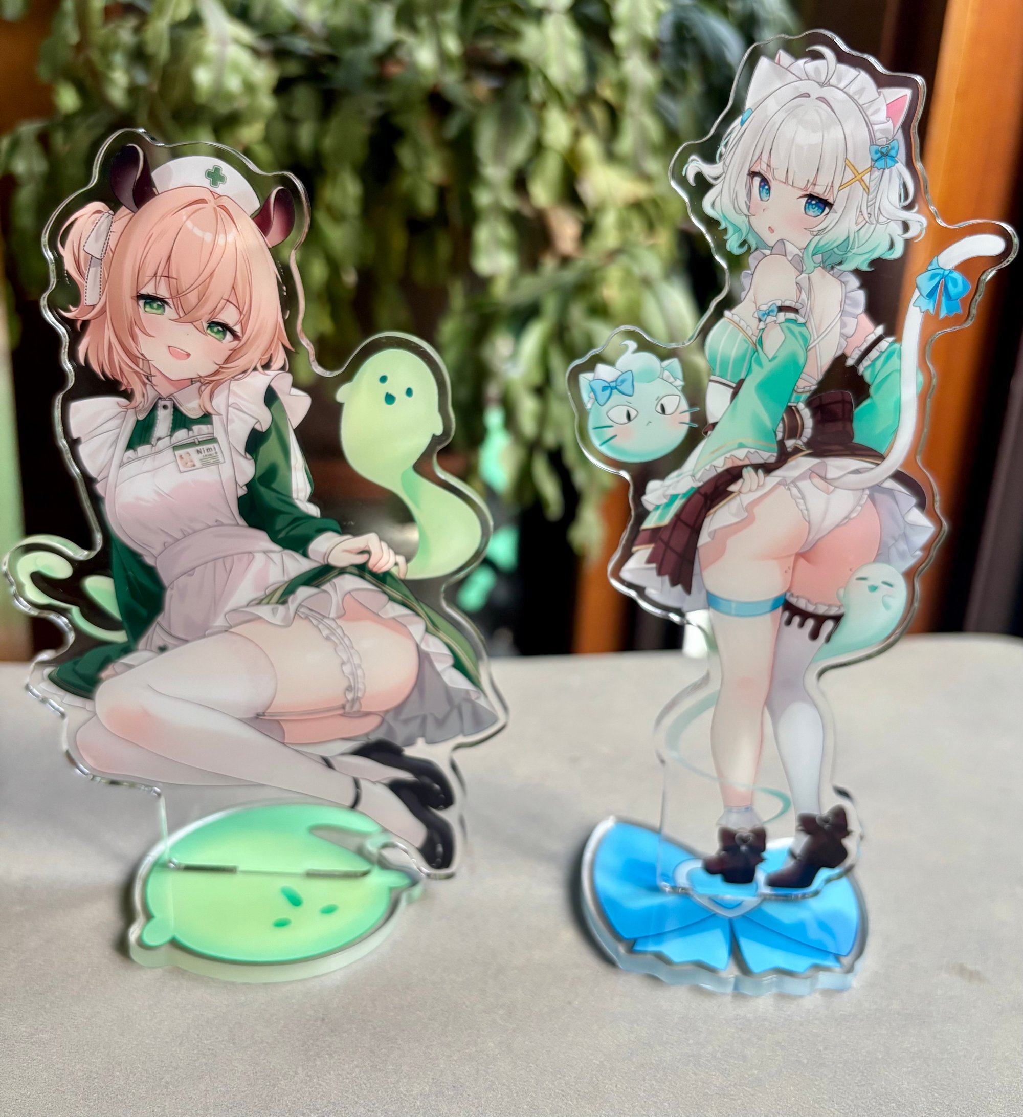 Stands are 15cm (Nimi) and 17cm (Mint), double sided acrylic with the same image on the front + back